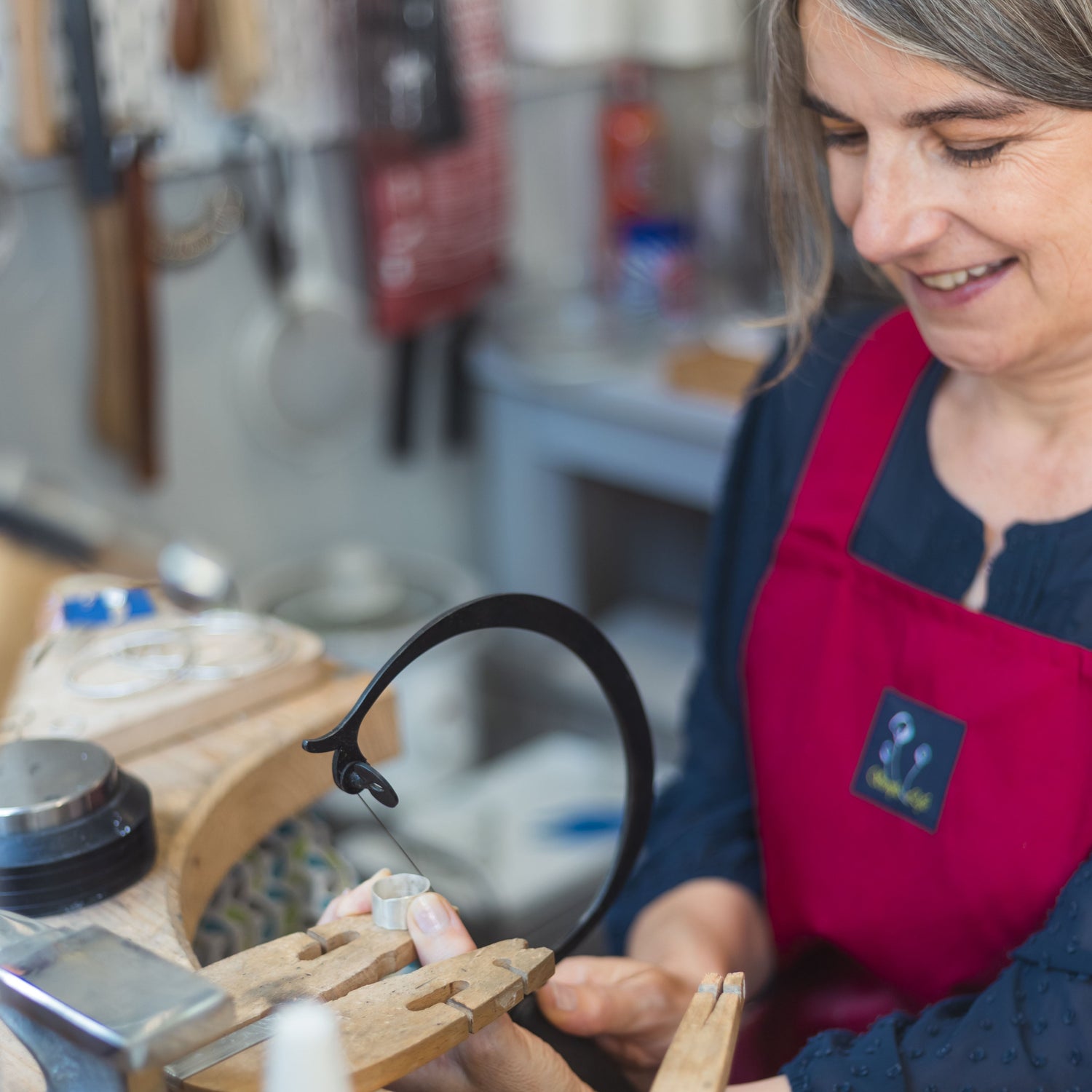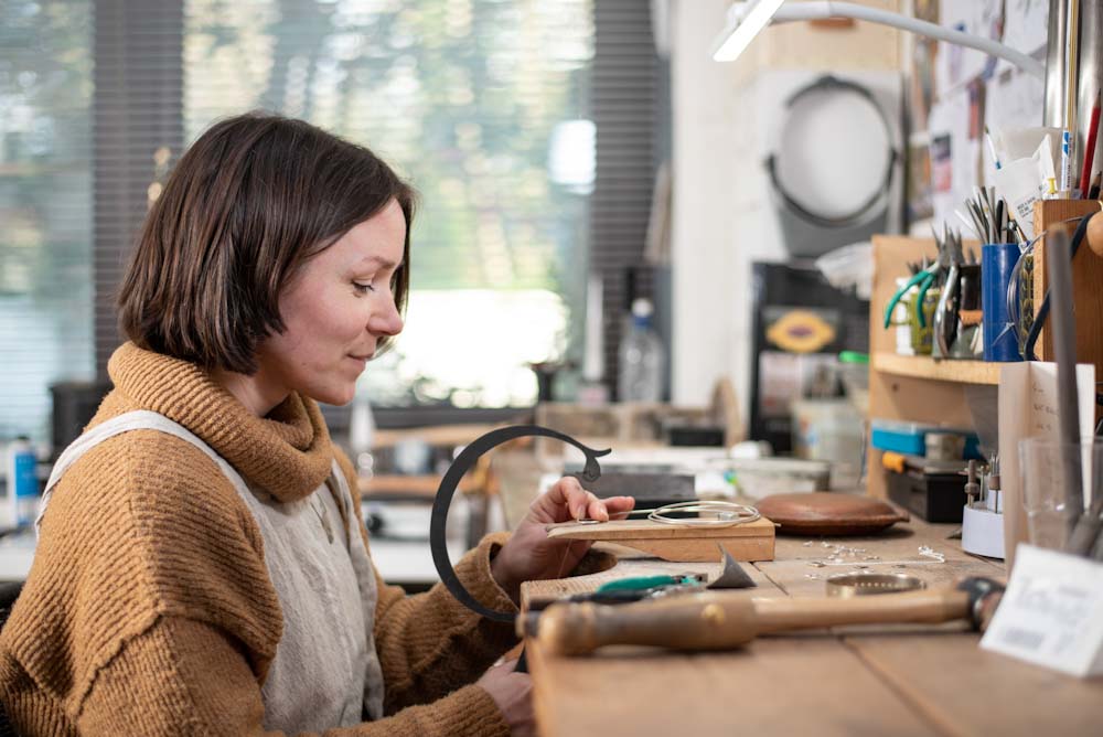 Susannah creates modern jewellery using traditional silversmithing techniques and more contemporary precious metal clay. Her main collection is inspired by the lace-making heritage of Nottingham. By imprinting lace onto the surface of silver and then forging the metal into fluid organic shapes the pieces reflect the movement of heavy lace.