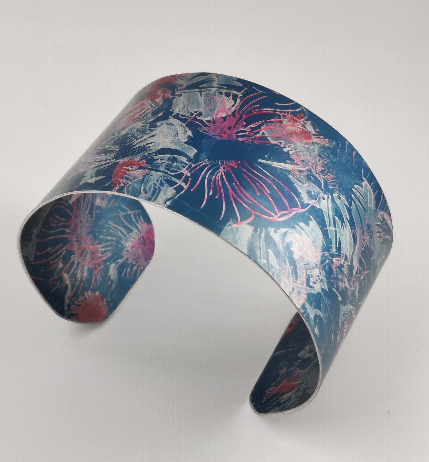 Using resist and immersion dye techniques, Julia creates abstract - and often quite experimental - patterns on the porous anodised layer of aluminium sheet. She then seals and finishes the metal and designs lightweight, elegant, and striking pieces of jewellery.